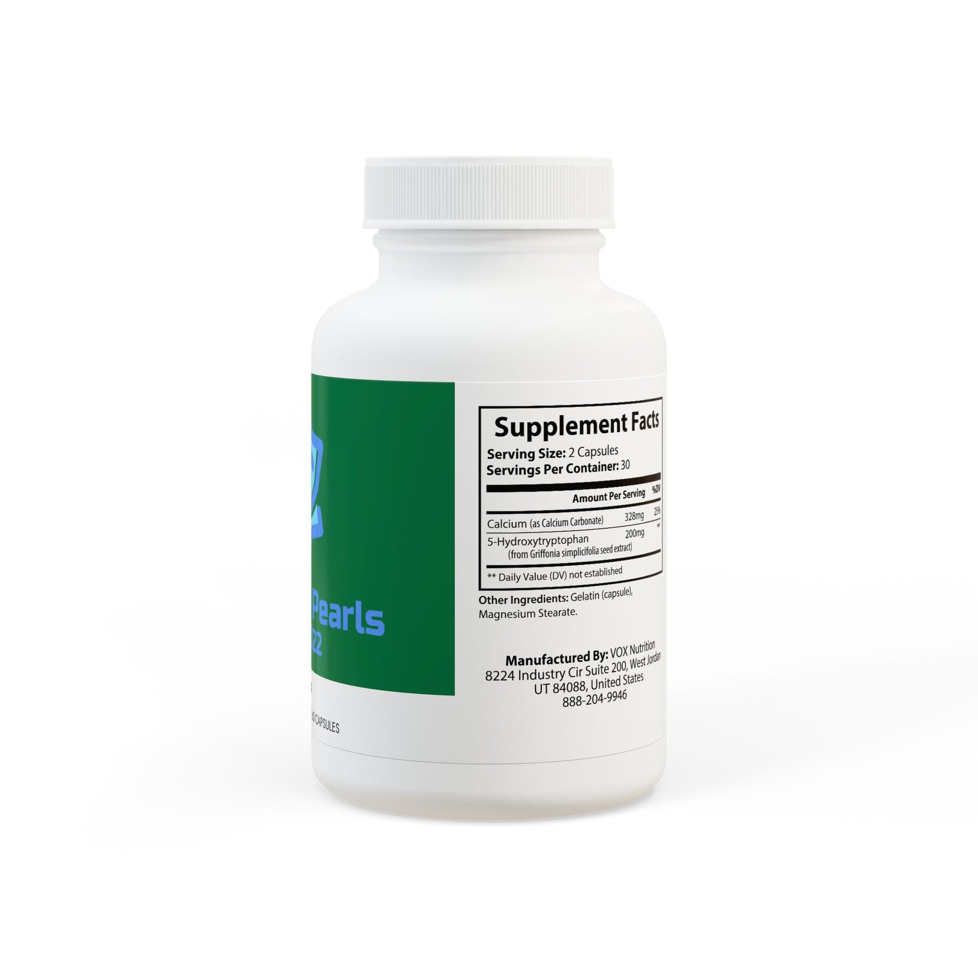 Ingredients: Calcium (as Calcium Carbonate), 5-Hydroxytryptophan (from Griffonia simplicifolia seed extract). Other Ingredients: Gelatin (capsule), Magnesium Stearate.