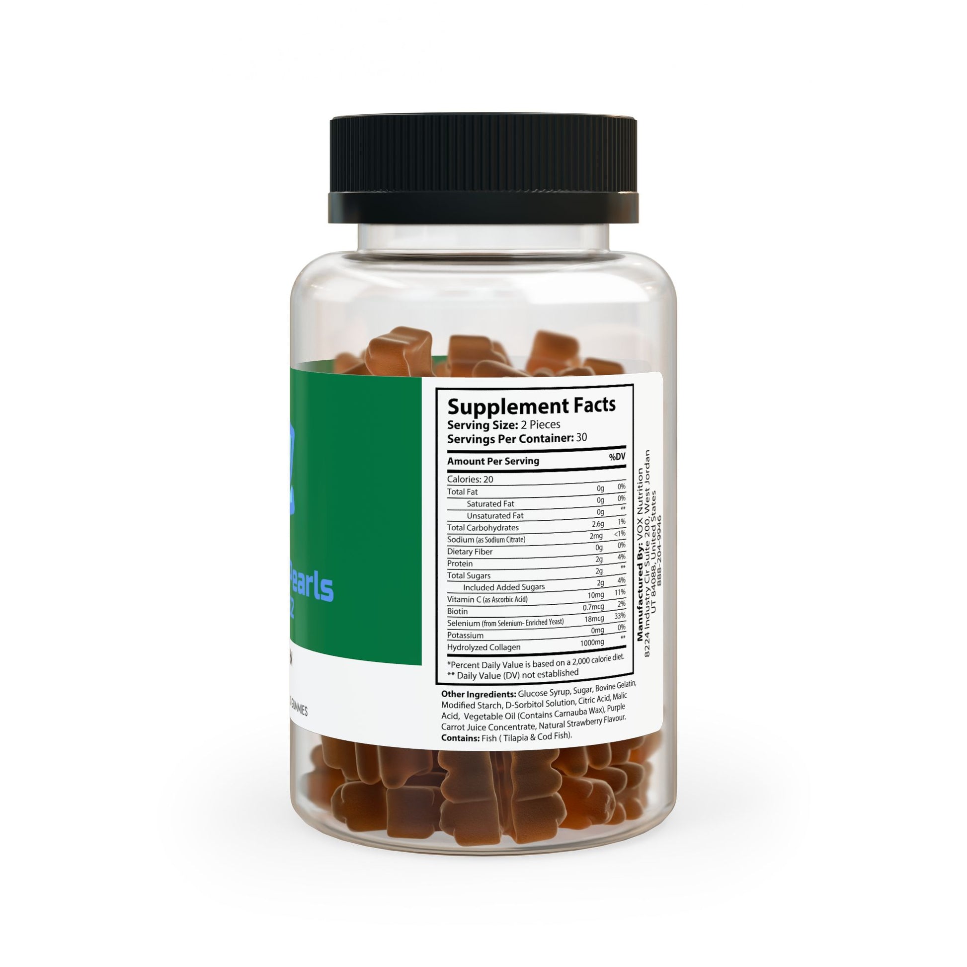 Ingredients: Sodium (as Sodium Citrate), Dietary Fiber, Protein, Included Added Sugars, Vitamin C (as Ascorbic Acid), Biotin, Selenium (from Selenium- Enriched Yeast), Potassium, Hydrolyzed Collagen. Other Ingredients: Glucose Syrup, Sugar, Bovine Gelatin, Modied Starch, D-Sorbitol Solution, Citric Acid, Malic Acid, Vegetable Oil (Contains Carnauba Wax), Purple Carrot Juice Concentrate, Natural Strawberry Flavour. Contains: Fish ( Tilapia & Cod Fish)